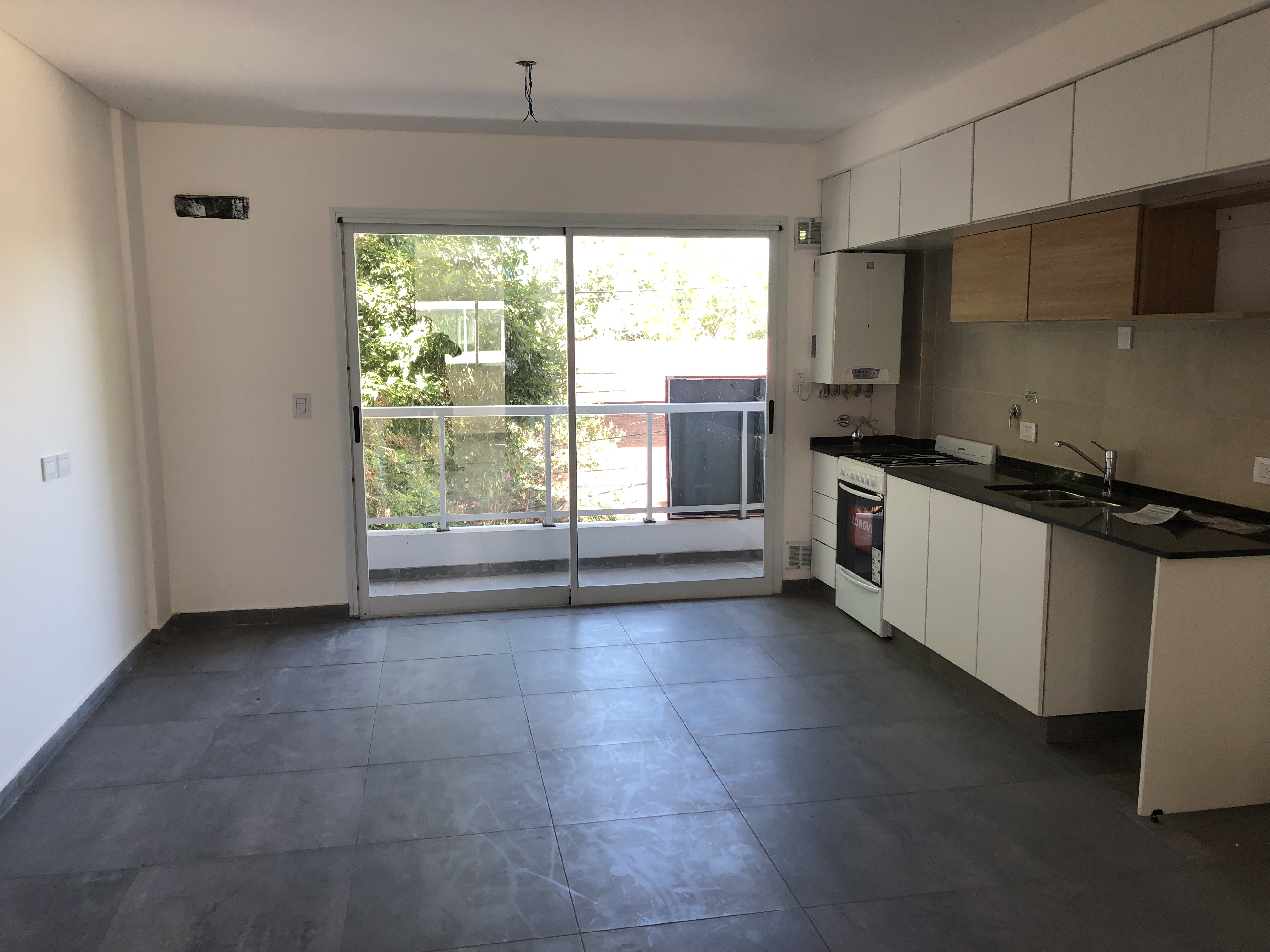 Departamento 1 ambiente divido con sistemas de mamparas conformando 1 dormitorio con placard - ambiente living cocina comedor con mesada bajo mesada y alacenas - baño completo con bañera - calefacción por piso radiante y agua caliente con caldera - balcón- cochera.